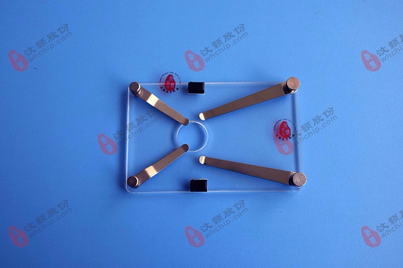 微流控芯片簡易夾具可用于PDMS、PMMA、PC等各種材質(zhì)微流控芯片固定夾持。夾具材質(zhì)為PMMA,夾具尺寸140*90mm,厚度5mm;觀察窗直徑25mm,固定桿方向可調(diào),芯片固定方便;導(dǎo)管固定裝置能有效避免導(dǎo)管散亂的問題。